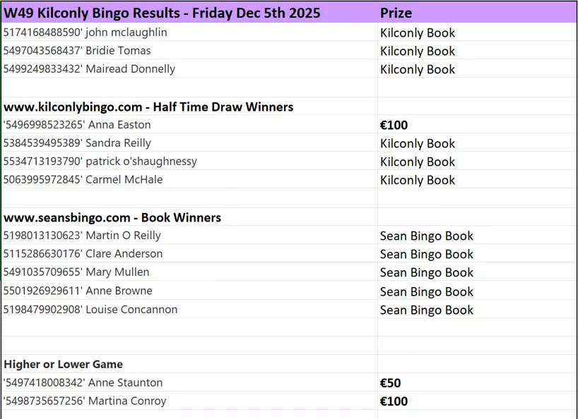 Here is the results and winners list from Kilconly Bingo's recent games: